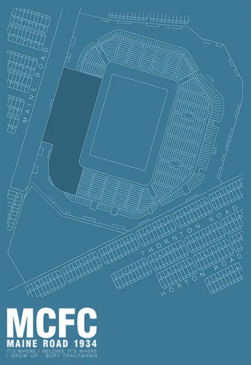 Gary also unearthed a wonderful quote from City legend Bert Trautmann (bottom left of the print) which reads: “It’s Where I Belong. It’s Where I Grew Up”