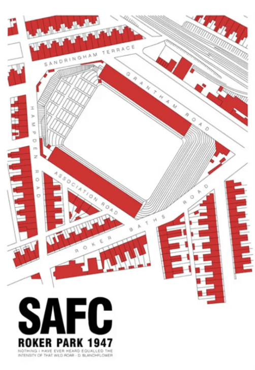 Steve’s use of a vivid red against a white background is not only a reflection of Sunderland’s celebrated plumage, but also a perfect representation of the area featured. As a kid, I can recall being struck by the red of the houses in the streets that surrounded Roker Park; the cloaking white fret that often rolled in from the North Sea made the brickwork appear more scarlet than other buildings in the region. It was entirely appropriate and, to a young football fan, looked most intentional. This was clearly a red and white town.