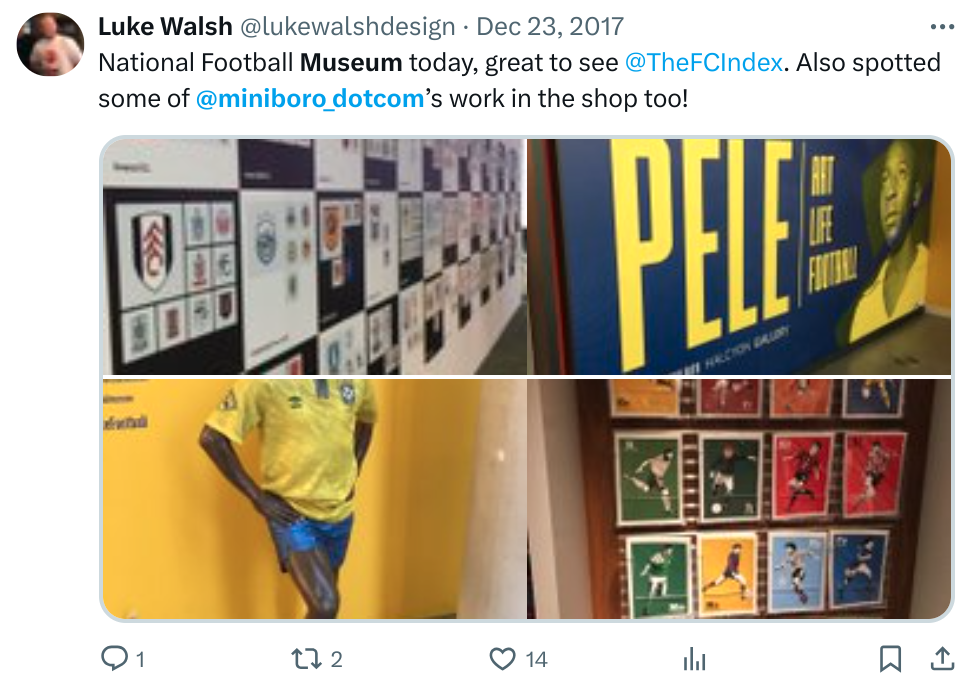 I’m very excited to say that my work can now be obtained directly from the National Football Museum in Manchester. A selection of my A-Z prints are already available in their shop and online, and I have plans to increase the range over the next few months.