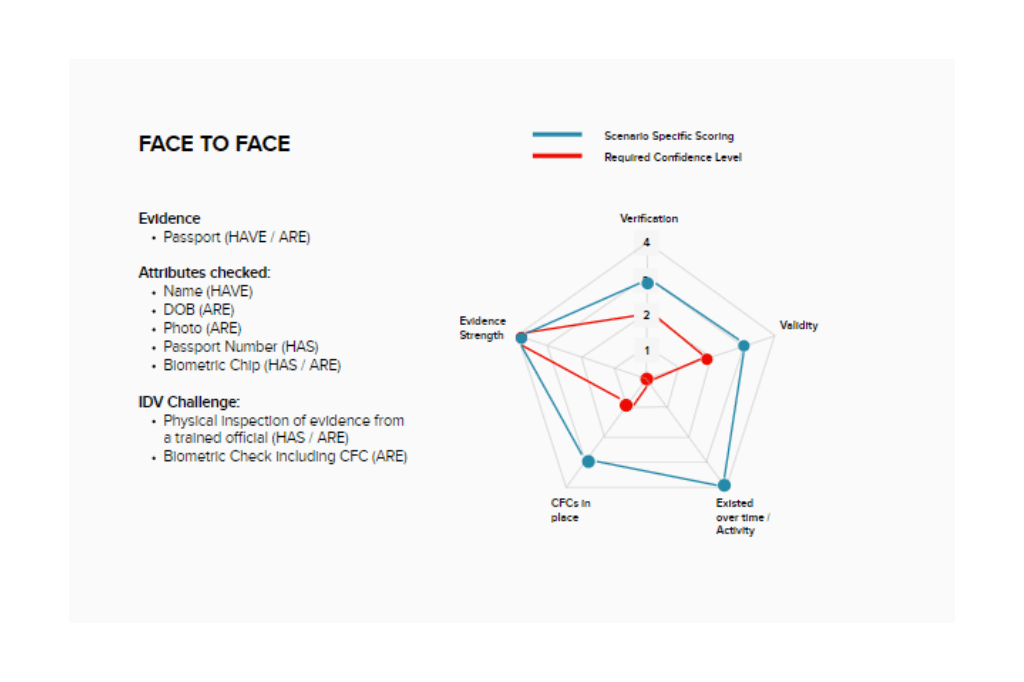 In this theoretical example, a citizen is using their passport as their singular piece of evidence and has been challenged in a face to face situation. The relative strength, validity, verification. activity and counter fraud check all score highly, with many exceeding the threshold for the M1A Profile. This is mainly due to the number of ways the evidence can be checked: