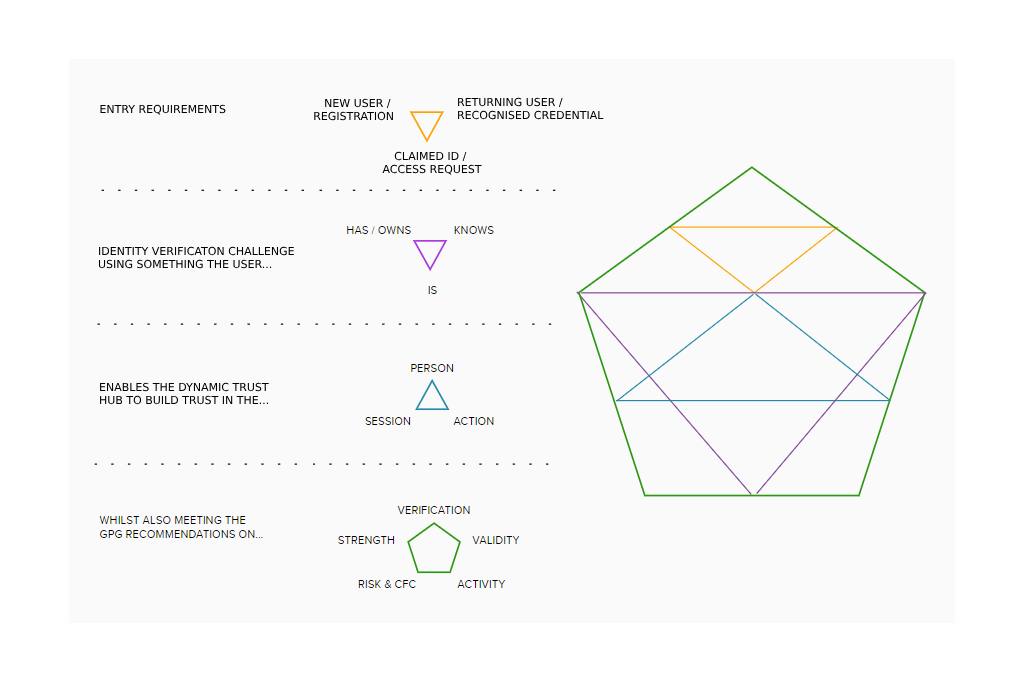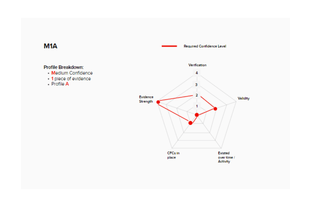 So for an ID challenge that requires a medium level of confidence. with only one piece of evidence submitted, but which also meets the GPG scores as defined by Profile A, you would be permitted to accept ‘M1A’. I decided to reintroduce my pentagons and represent this information in the following way: